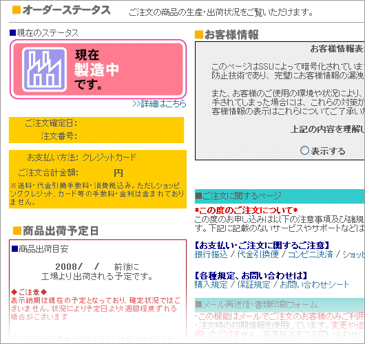| トップページ > カスタマイズ・購入方法 > オーダーステータス |